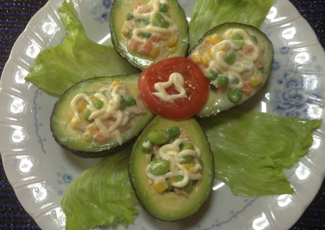 - Partimos los aguacate y le echamos unas gotas de limón Y comenzamos a rellenarlo..lo adorno con una rodaja de tomate y lechuga por los costado seguido de mayonesa por encima del relleno... esta súper buenazooooo..