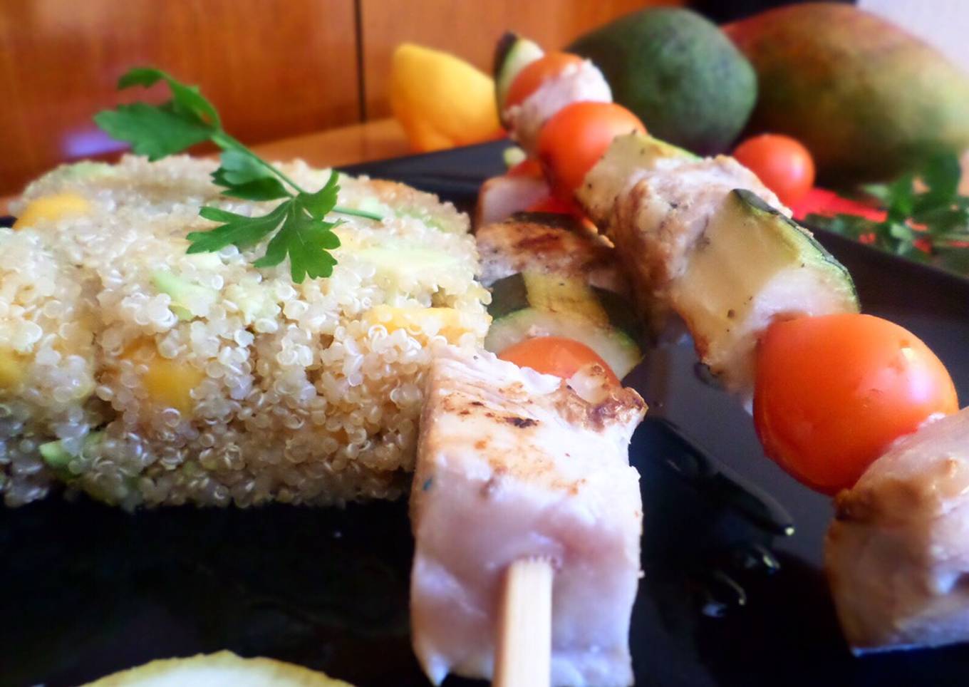 Hello everybody, I hope you are having an incredible day today. Today, we're going to make a distinctive dish, Brochetas de bonito y calabacín con guarnición de quinoa, mango y aguacate. One of my favorites. This time, I will make it a little bit unique. This is gonna smell and look delicious.