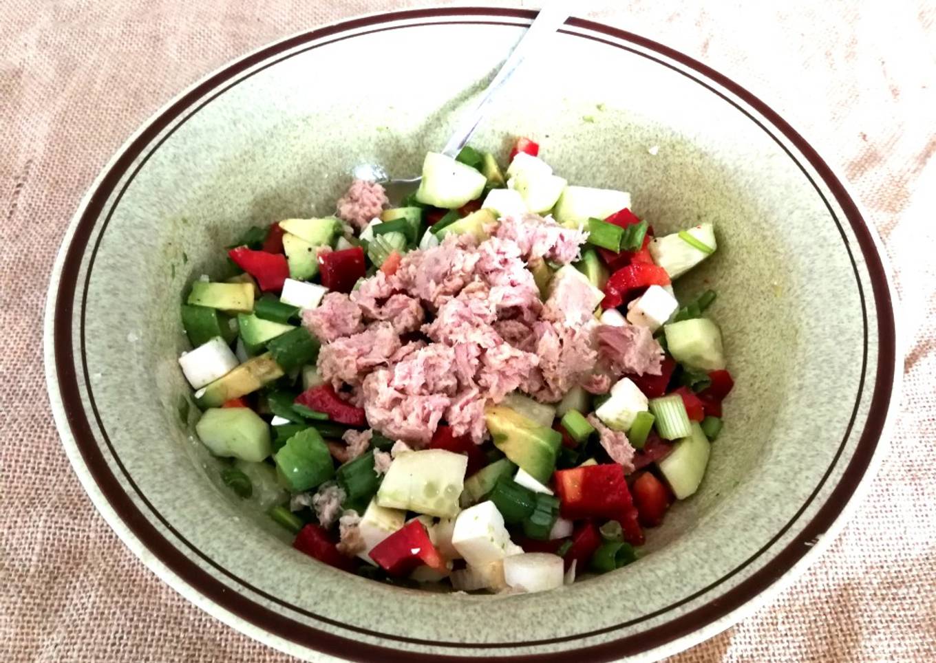 Steps to make to make Ensalada de aguacate, atún y queso feta