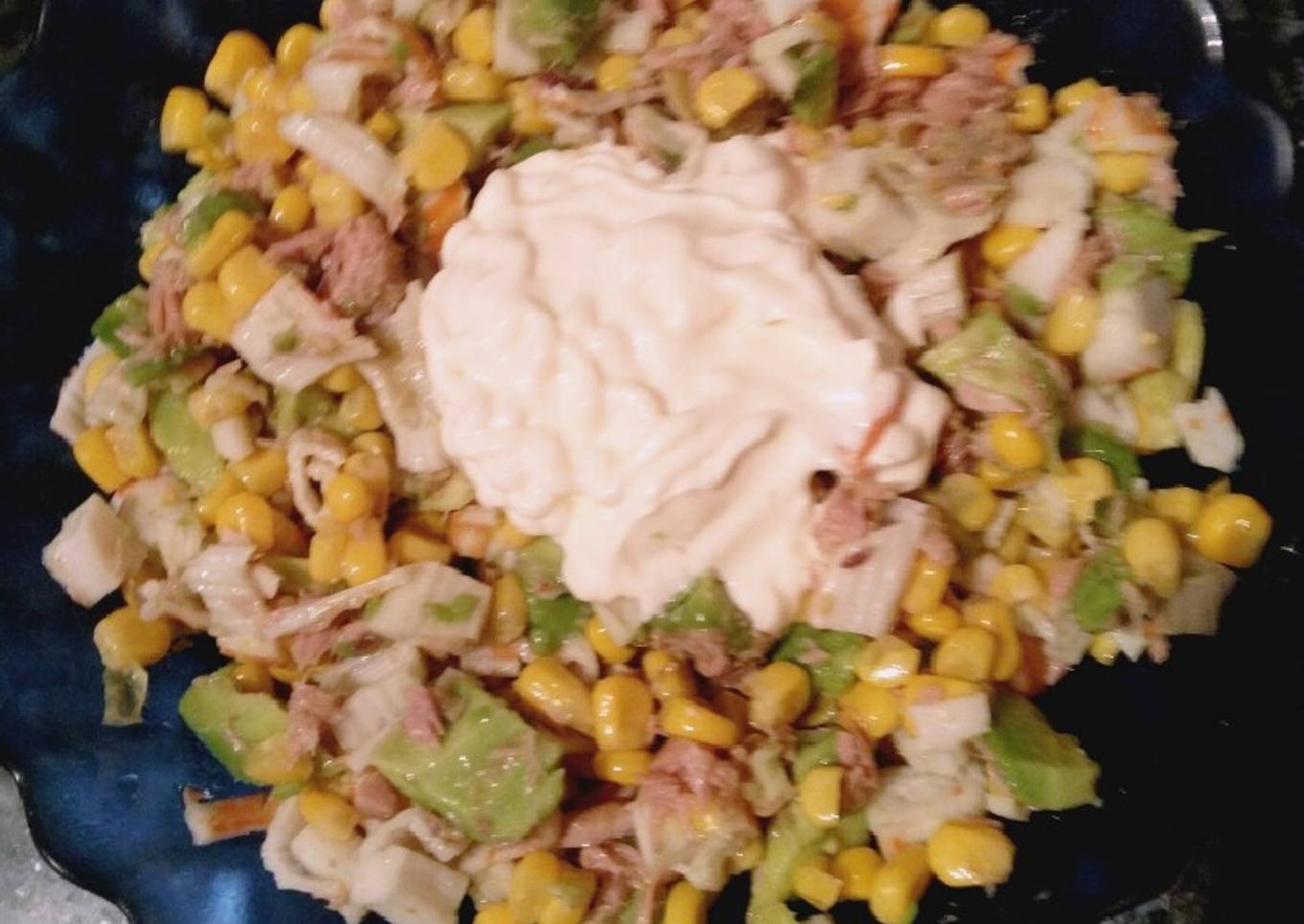 - Ponemos el maíz, el atún junto con los palitos de cangrejo picados.