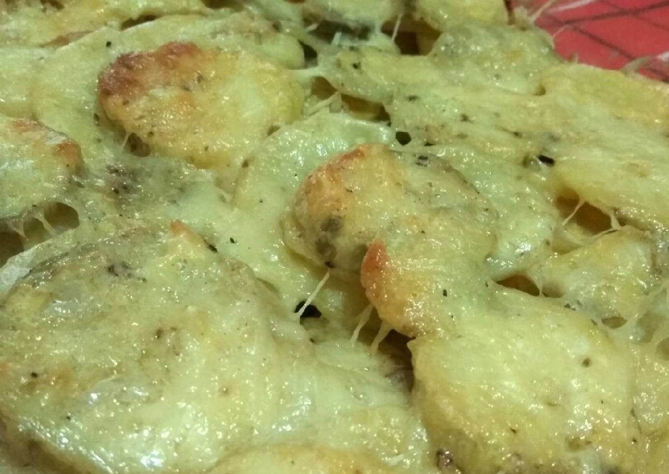 - Colocar una capa de papas crudas esparcidas sobre un recipiente rectangular apto para horno, por encima echar una parte mínima de la cebolla de verdeo. Luego colocamos por encima una capa de batata y después nuevamente cebolla de verdeo, repetimos el proceso hasta terminar. En cada capa colocar sal y pimienta a gusto.