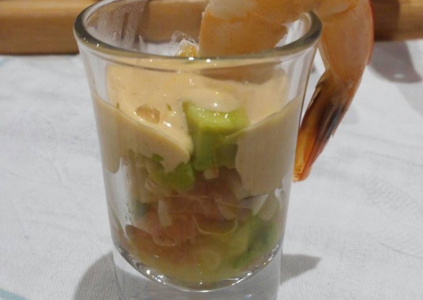 - Llenar los vasitos con el preparado de gambas y cubrir con un poco de salsa cocktail. Poner una gamba entera como guarnición. Servir bien fresquito.