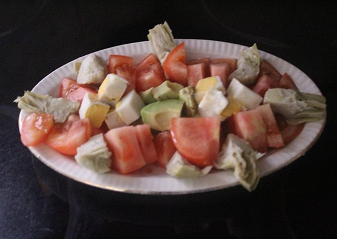 Ensalada de aguacate, huevo, alcachofa y tomate