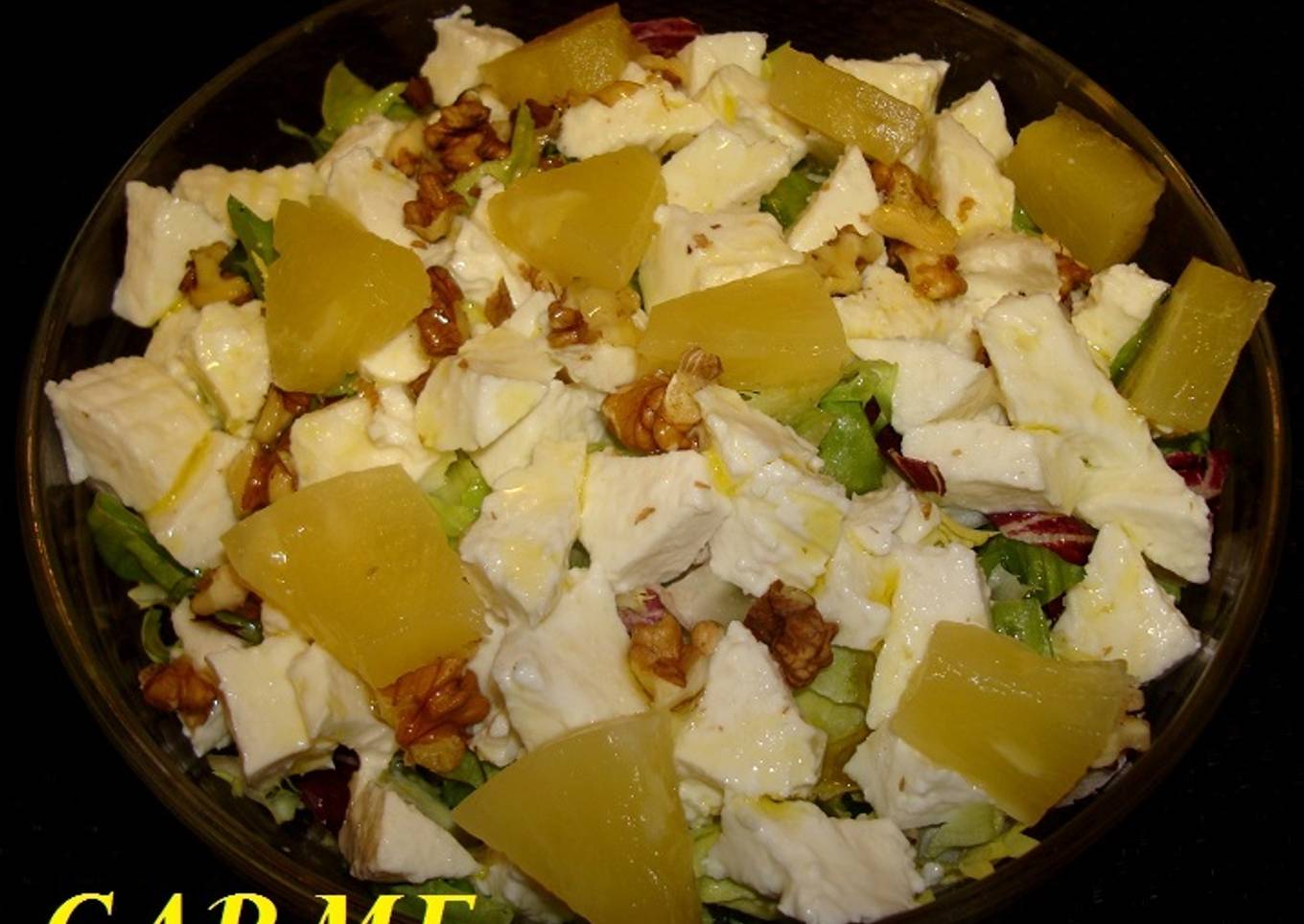 Ensalada tropical de aguacate, piña, queso fresco y nueces. Rica y nutritiva.