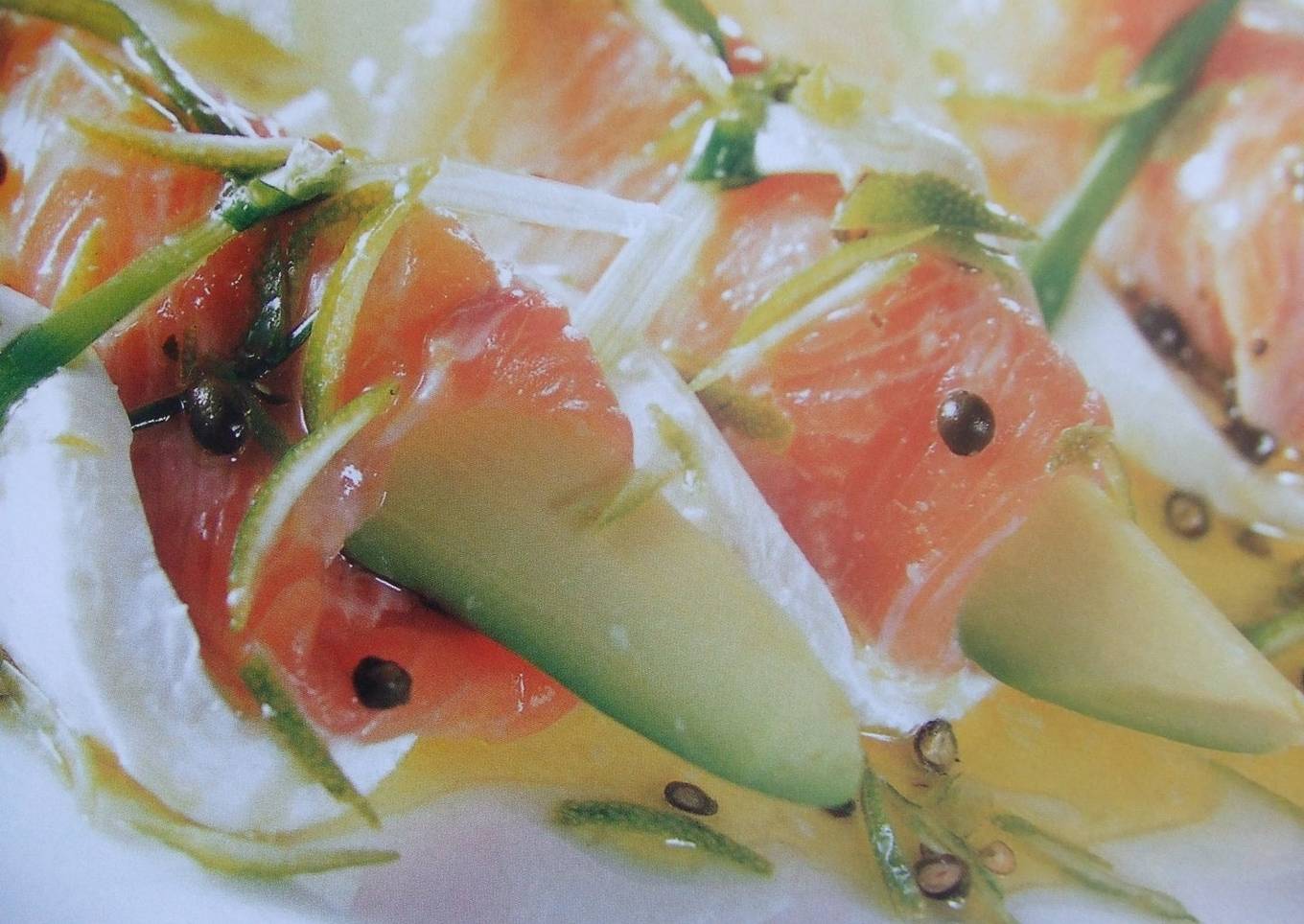 - Encima de cada trozo de queso poner un trozo de aguacate envuelto en salmón.