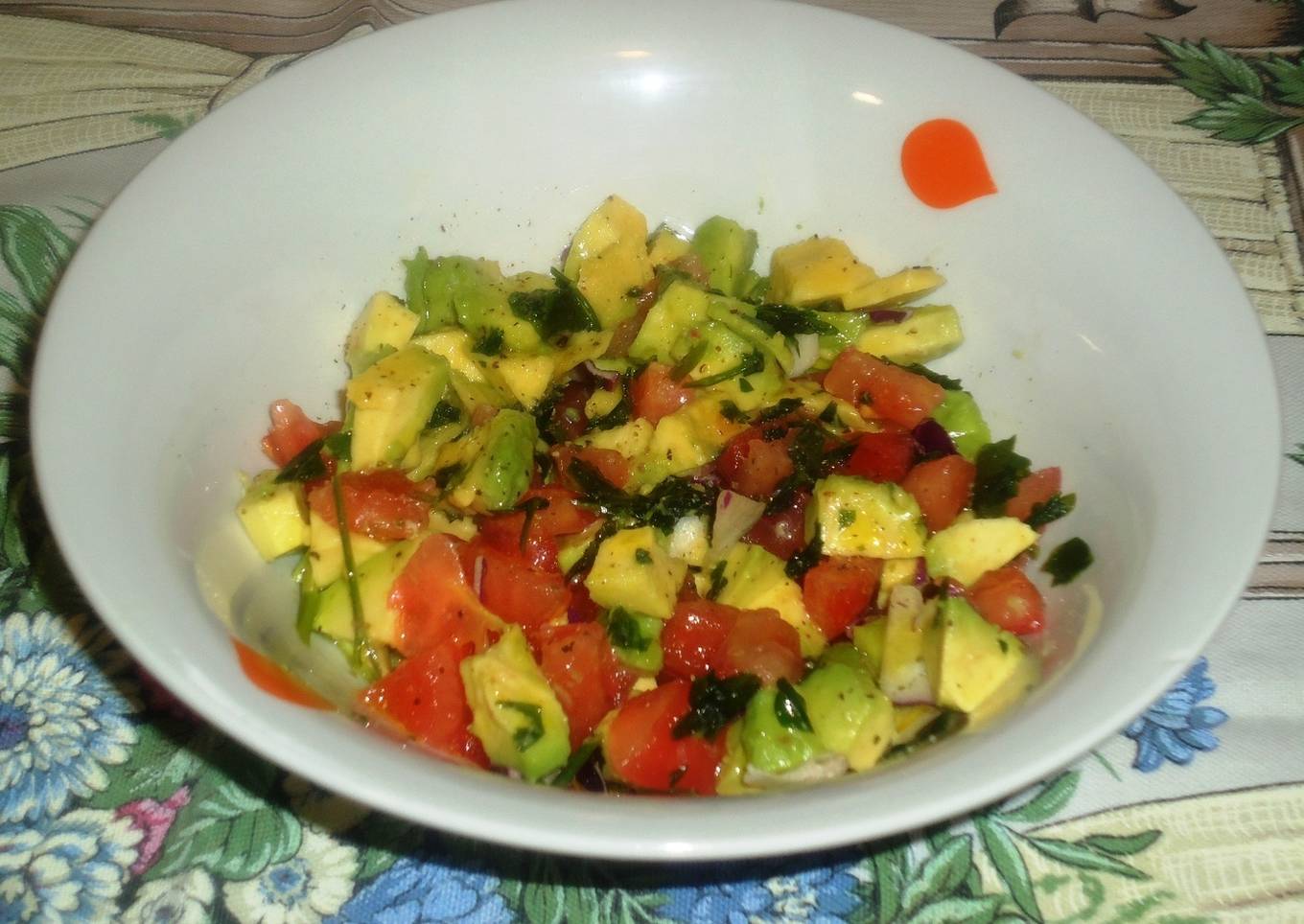 Ensalada de aguacate con cebolla y tomate, se aliña con zumo de limón, cilantro, aceite, sal y pimienta.