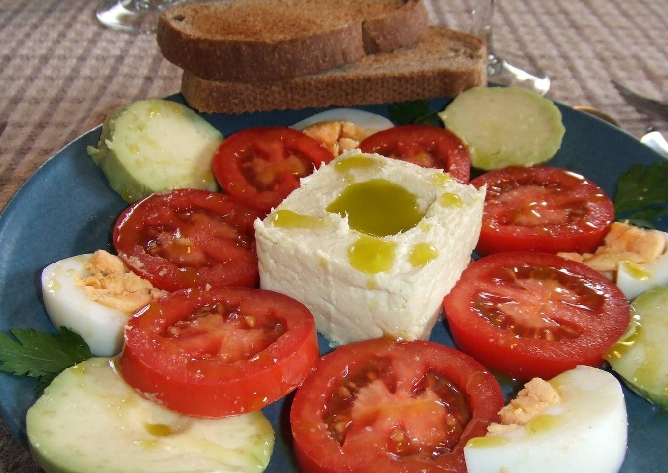 - En el centro del plato moldeamos la brandada con un molde. Lavar y secar los tomates y cortarlos en rodajas medianas. Pelar los huevos duros y partirlos en rodajas.