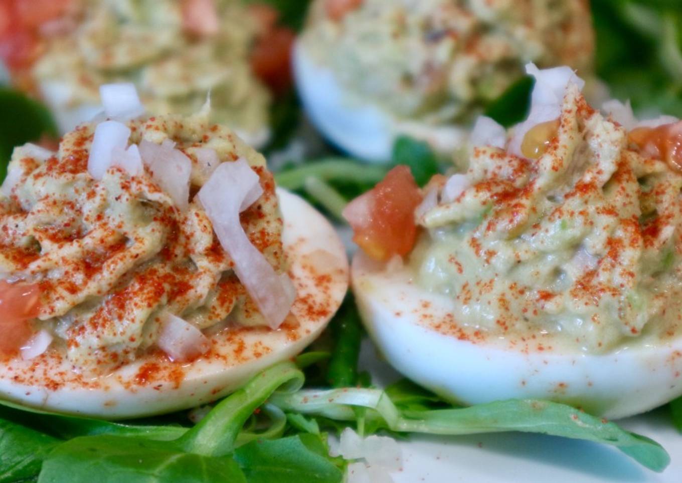 - Ahora pelamos todos los huevos, les damos un corte por la mitad y retiramos todas las yemas, en un bol amplio añadimos los aguacates limpios junto la cebolla y el tomate picados, el zumo de medio limón y ña sal y pimienta, machacamos y removemos todo con ayuda de unas varillas hasta formas una especie de guacamole, si te gusta el picante puedes añadir unas gotas de tabasco.