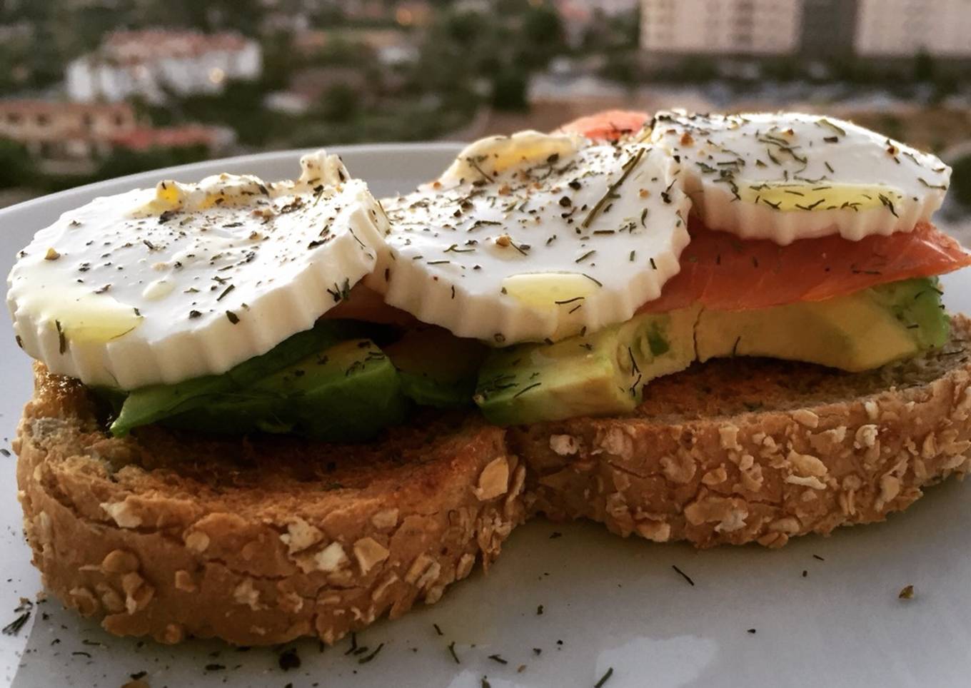- Montar la tostada: pan tostado, aceite, aguacate a láminas, salmón ahumado, queso fresco y aliñar con otro poco de aceite, pimientas recién molidas y eneldo de bote.