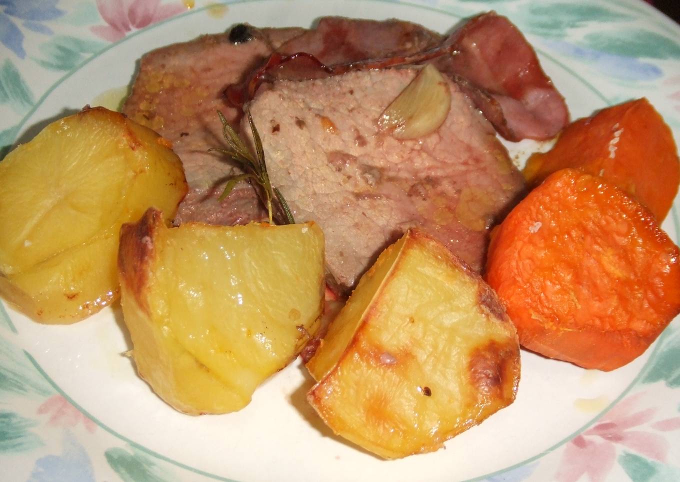 - Retirar la carne colocar las patatas y los boniatos en la fuente y regar con un poco de aceite.