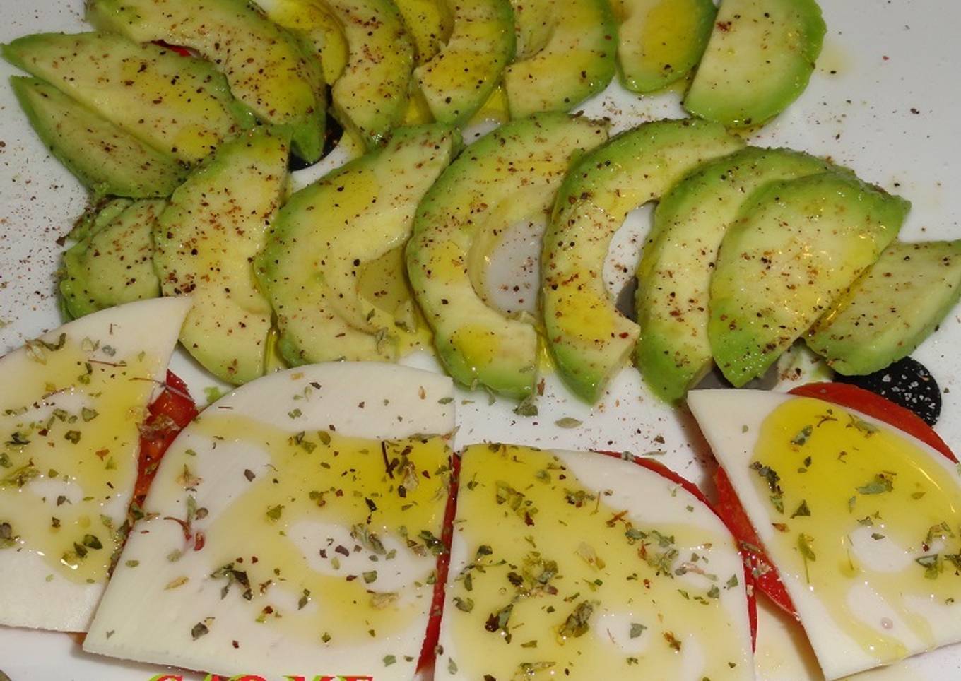 - Colocar alternativamente rodajas de tomate, aguacate y queso mozarella. Sazonar con sal y pimienta negra, trocear la albahaca y espolvorear convenientemente sobre la ensalada.