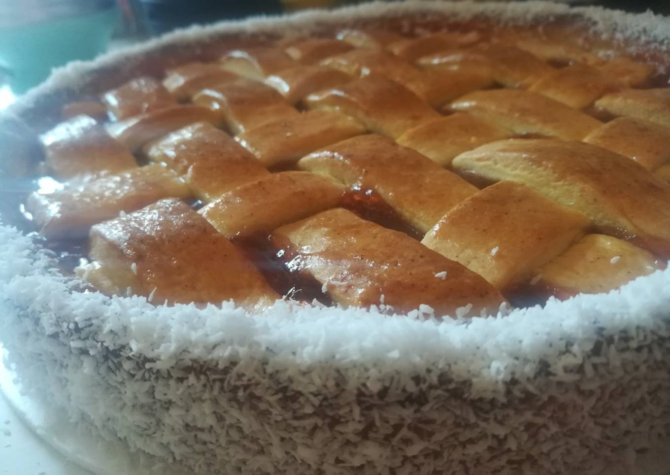 Forramos todo el molde con 3/4 parte de la masa, reservamos 2/4 para la rejilla. Luego vertemos el dulce frío y procedemos a formar las tiras para terminar la pastafrola. Horneamos en un horno precalentado a 180 grados durante 15 minutos. Retiramos,pintamos con jalea o dulce y terminamos con el coco rallado.