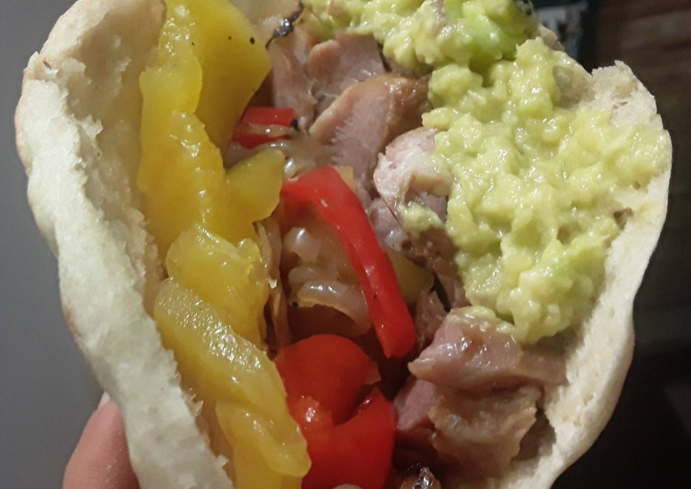 Para cenar panes de pita rellenos de piña dulce, pimentones salteados, carne de cerdo asada, cebollas salteadas y puré de aguacate!!! Receta inspirada en una de las exquisitas y prolijas preparaciones de @catalinabdelgado , para Ella sólo agradecimientos... #asísabecolombia