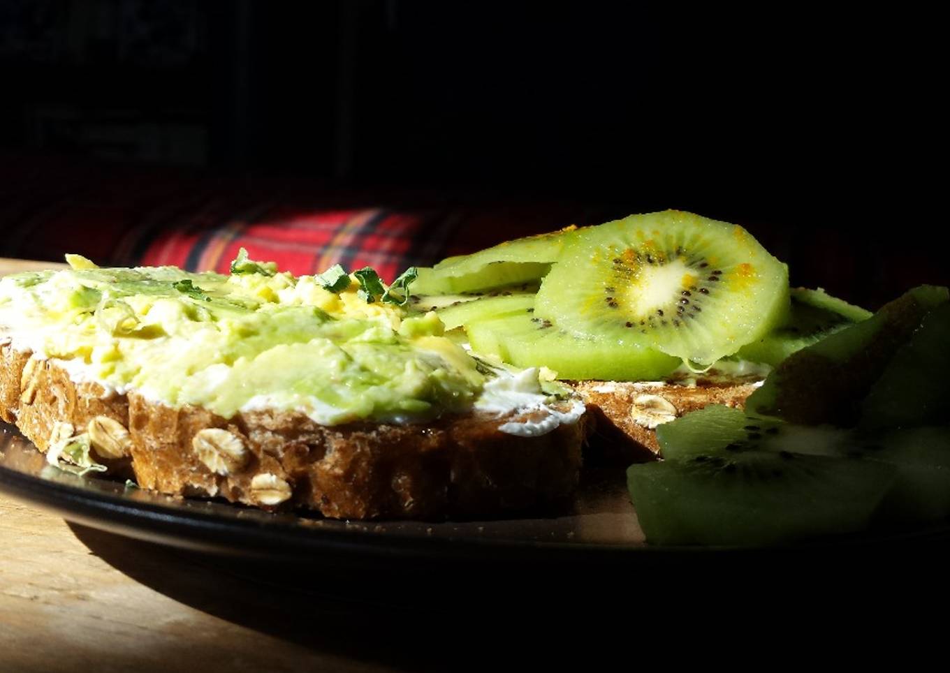 - Tostar el pan, untar cada una de las rebanadas con queso philadelphia. Después untar el aguacate en una y el kiwi en la otra.