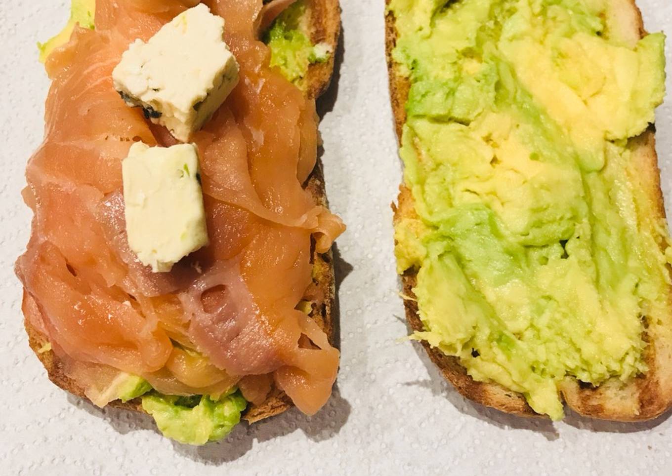 - Ponemos el pan en la plancha una vez caliente. Lo planchamos. Le untamos aguacate en ambas caras. Ponemos rodaja de tomate, salmón cebolla y queso. Cerramos y a degustar. Podemos poner Huevo duro. Bon profit! Buen provecho!