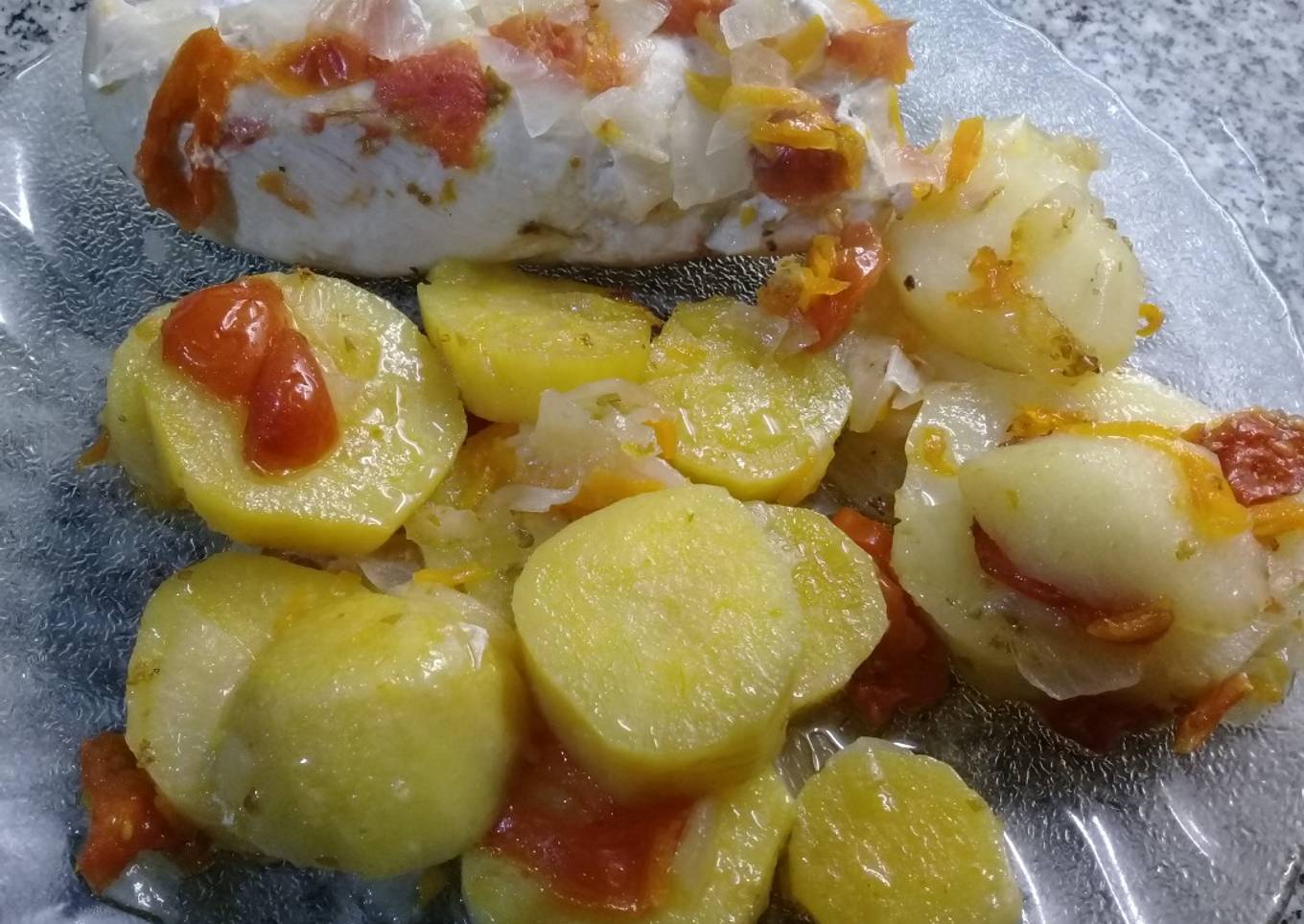 - Ponemos sobre todo esto las supremas y papas y batatas cortadas en rodajas. Condimentar a gusto. Si les gusta crocante llevar a horno fuerte así como está. Si les gusta jugoso llevar a horno medio tapado con papel aluminio. Yo lo hago de ésta últimamanera...